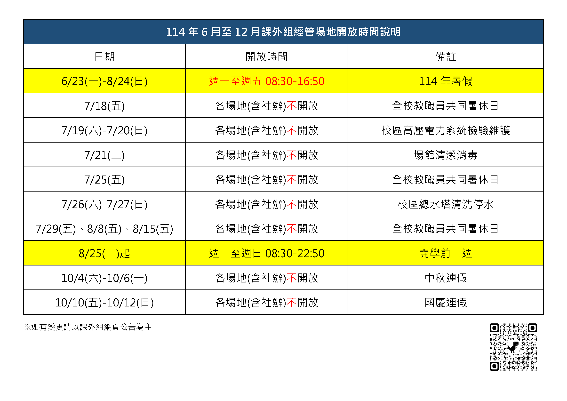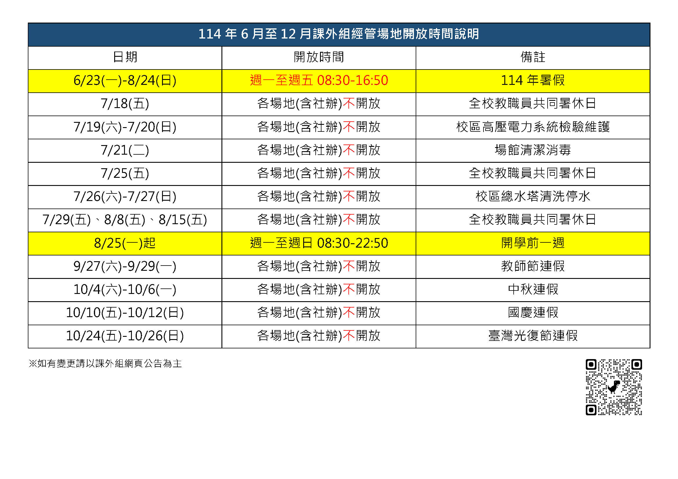 【場館】114年6月至12月課外組經管場地開放時間說明(7/1更新公告)