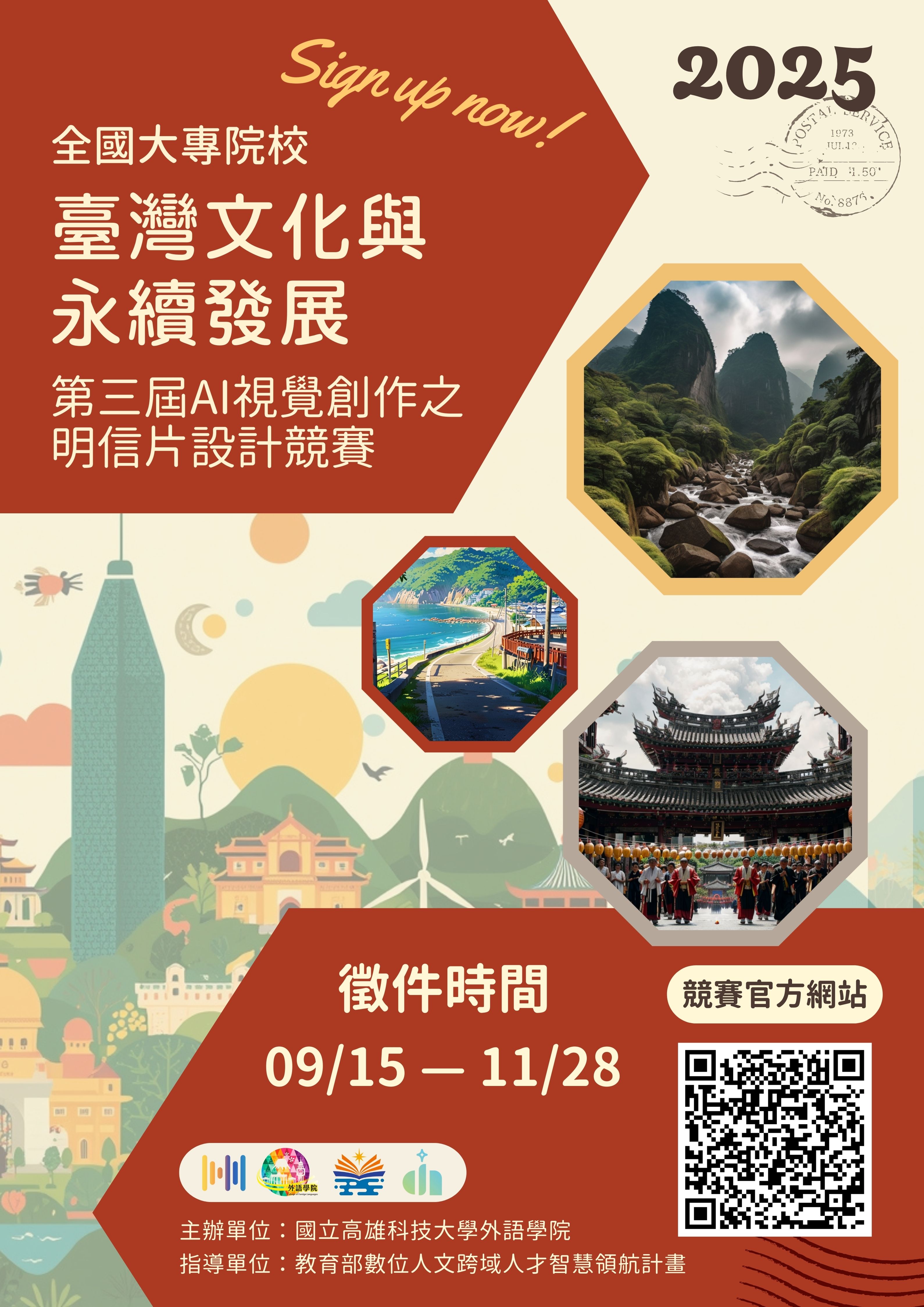 一、今年2025「臺灣文化與永續發展:第三屆AI視覺創作之明信片設計競賽」為本院「數位人文計畫」舉辦競賽活動,鼓勵參賽者深入探索臺灣文化,並透過英文和AI繪圖技術創作明信片,展現對臺灣永續發展的觀察與期望。本競賽以線上投稿方式選拔全國具潛力的優秀團隊。