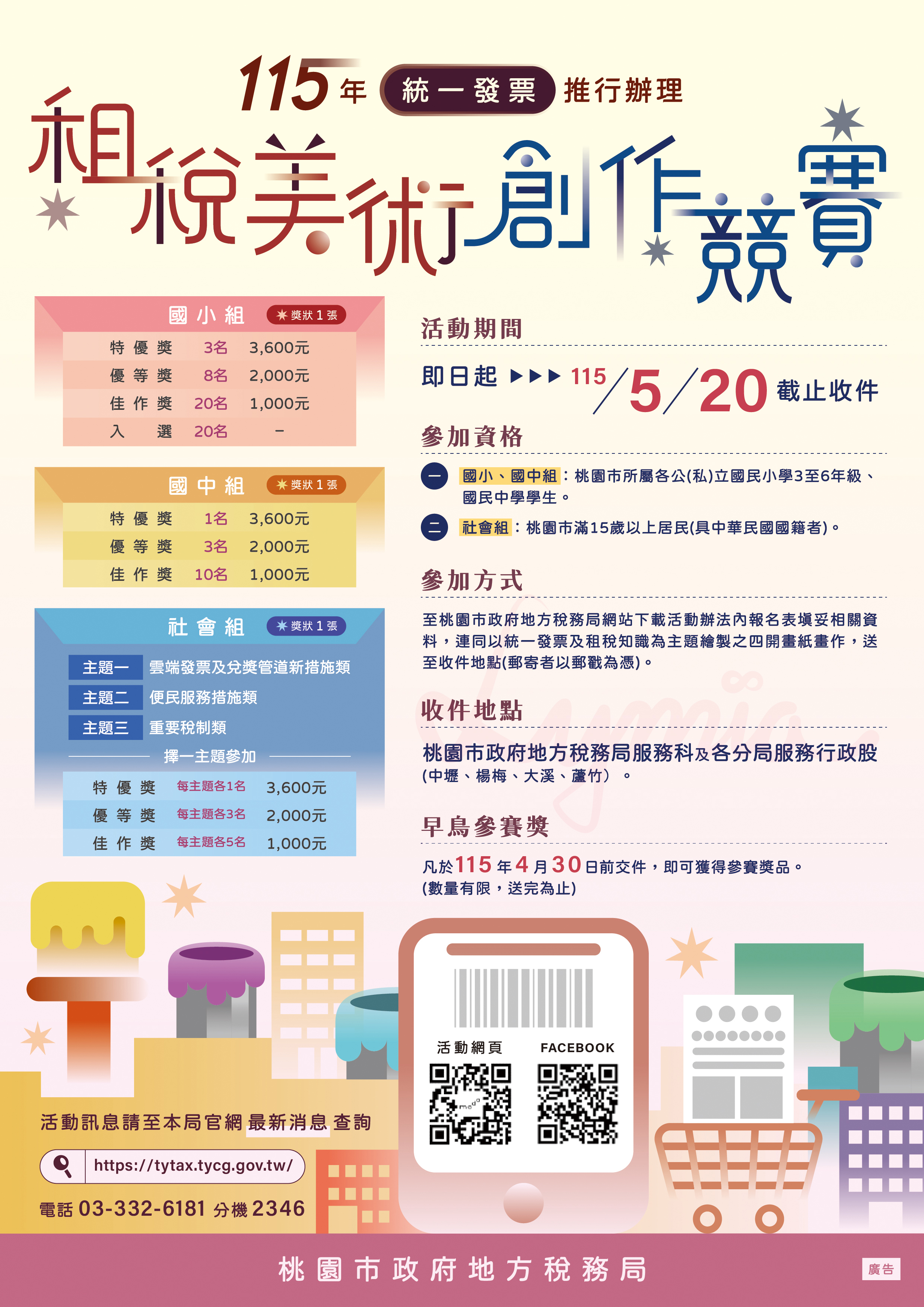 該局表示,本次比賽分為國小組(桃園市國小3至6年級)、國中組及社會組(桃園市滿15歲以上具中華民國國籍居民)等3組,其中社會組分為雲端發票及兌獎管道新措施類、便民服務措施類及重要稅制類等3類主題,參賽者可擇1主題發揮。各組獲得特優獎者,可獲得新臺幣3,600元獎金,獲優等獎及佳作獎者,可分別獲得獎金2,000元及1,000元。為鼓勵國小學童踴躍參與,今年國小組新增20名入選獎,擴大表揚優秀創作。另如提早於115年4月30日前交件者,可獲得早鳥獎1份,數量有限,送完為止。