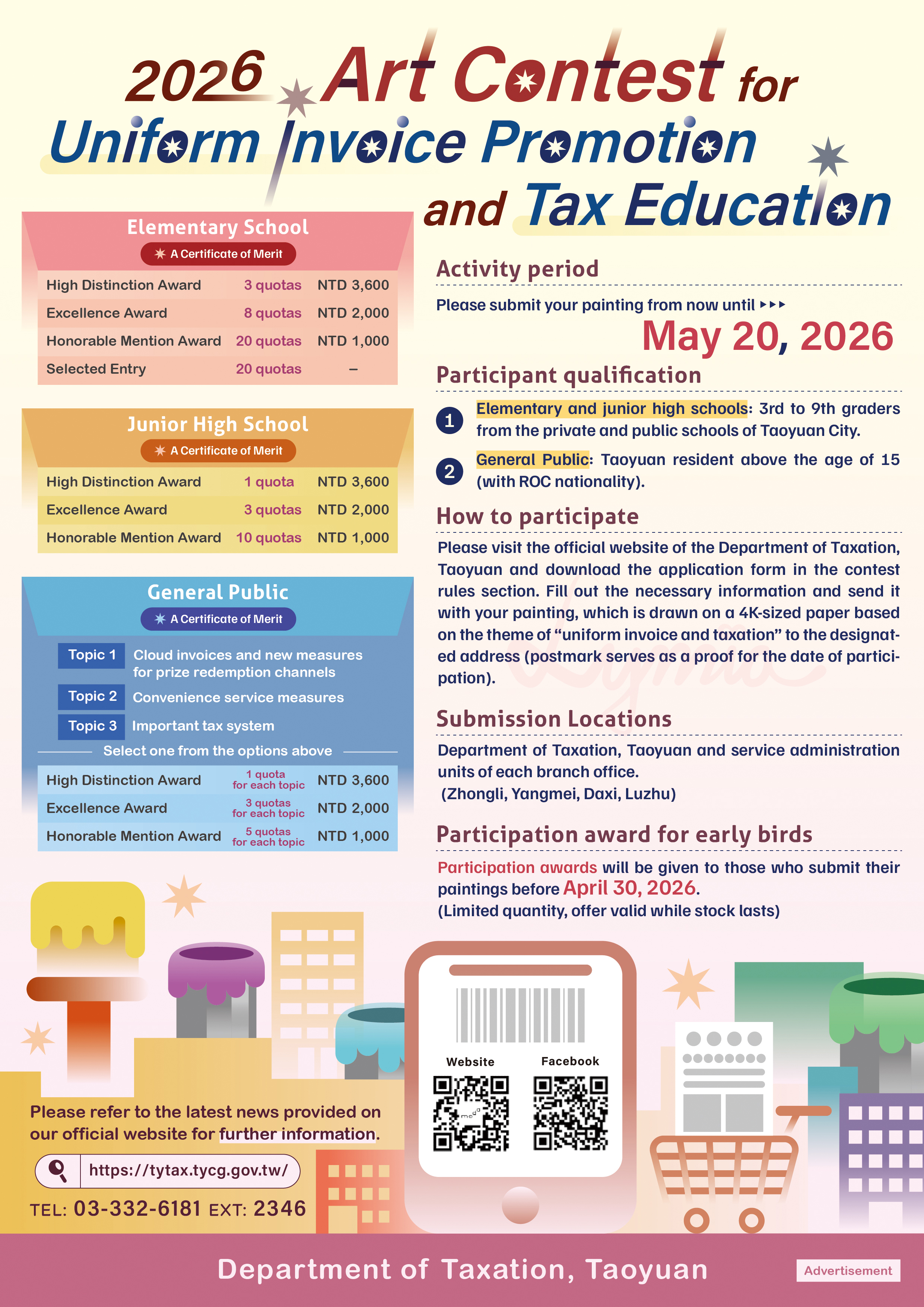 為提升民眾對於租稅的認識,鼓勵以美術創作繪出租稅與生活,桃園市政府地方稅務局特別舉辦「115年統一發票推行辦理租稅美術創作競賽」,邀請桃園在地學生及社會人士,自即日起至115年5月20日止,一起繪出租稅的風貌。